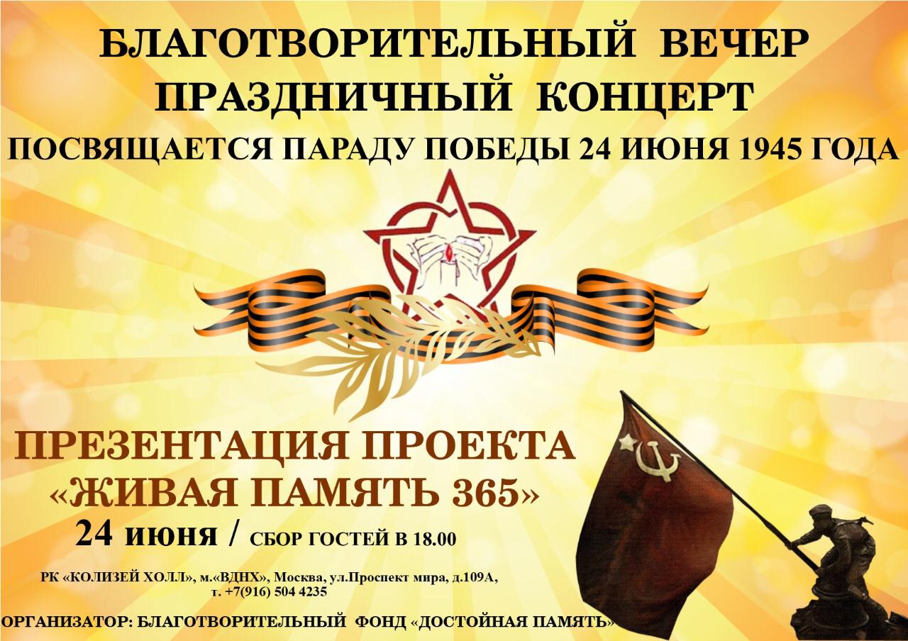 Целью проведения благотворительного вечера является Презентация Международного Проекта «Живая память 365», как знак признания и сохранения памяти наших предков все 365 дней в году и сбор средств на ремонт и восстановление воинских захоронений и могил умерших ветеранов Великой Отечественной войны. На Благотворительном вечере, Вы сможете ознакомится с работой Фонда и получить информацию об акциях, мероприятиях и проектах, реализуемых Фондом.